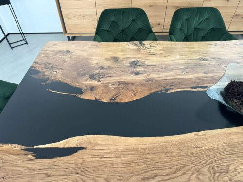 Aureo– Massiver Eichenholztisch mit Epoxidharzfüllung und natürlicher Baumkante