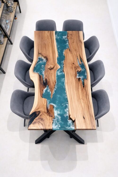 Noctis River – Moderner Epoxidharz Tisch mit markanter Flussoptik und Bootsform