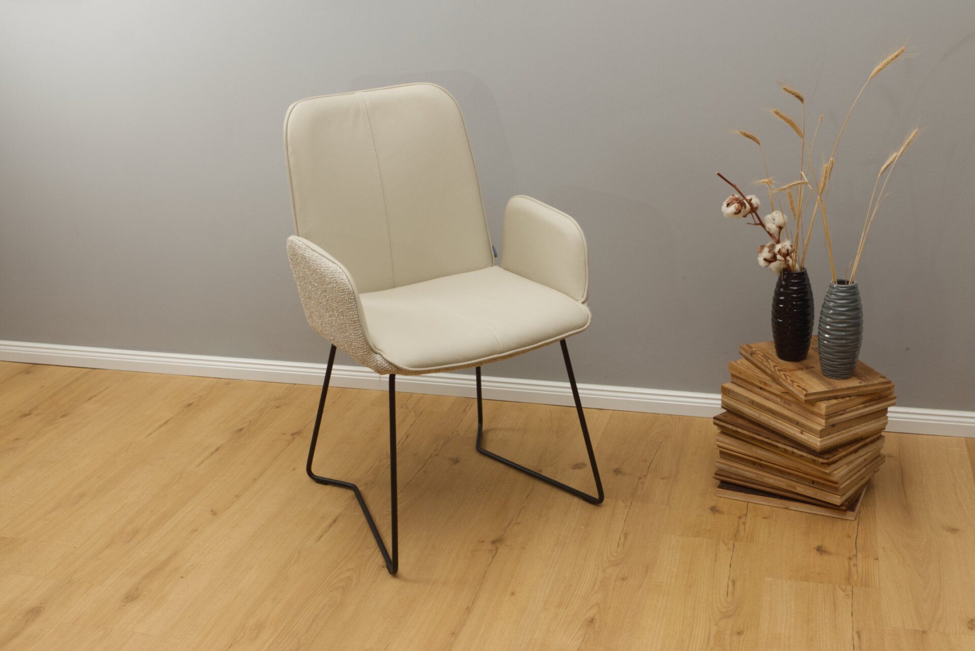 Brees New World vereint modernes Design mit höchstem Sitzkomfort und ist die perfekte Ergänzung für Esszimmer oder Küche. Der elegante Stuhl überzeugt durch seinen hochwertigen Materialmix: Eine Sitzfläche aus Echtleder in edlem Beigeweiß sorgt für eine luxuriöse Optik und eine angenehme Haptik, während der Stoffbezug an den Seiten einen stilvollen Kontrast und zusätzliche Gemütlichkeit bietet.