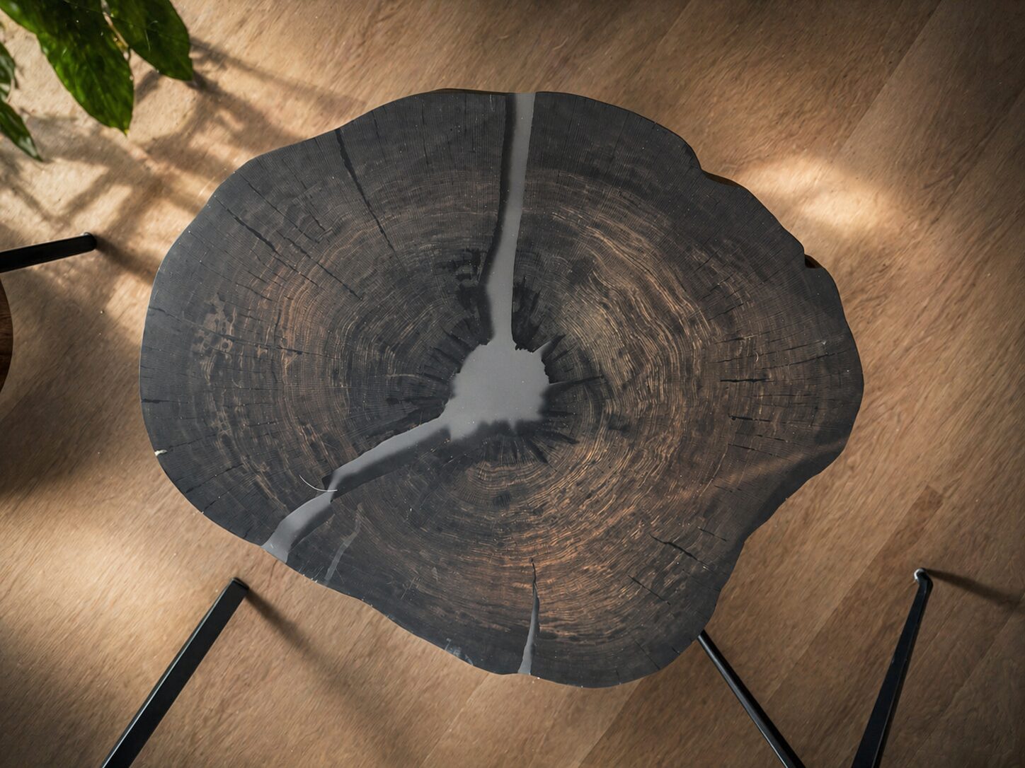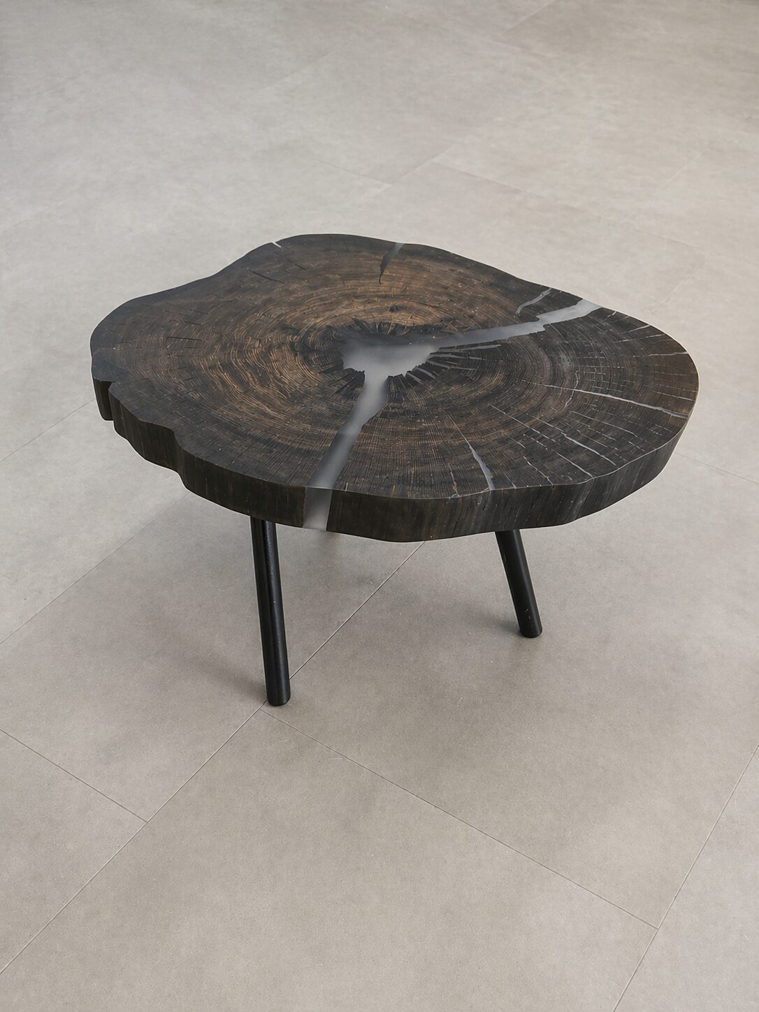 Dieser einzigartige Couchtisch ist aus Mooreiche gefertigt, die bis zu 5000 Jahre alt ist, wodurch er eine faszinierende Geschichte erzählt. Durch die Verwendung von Epoxidharz wurde ein besonderer Sofatisch geschaffen, der von Natur aus schwarze Akzente mit helleren Stellen aufweist.
