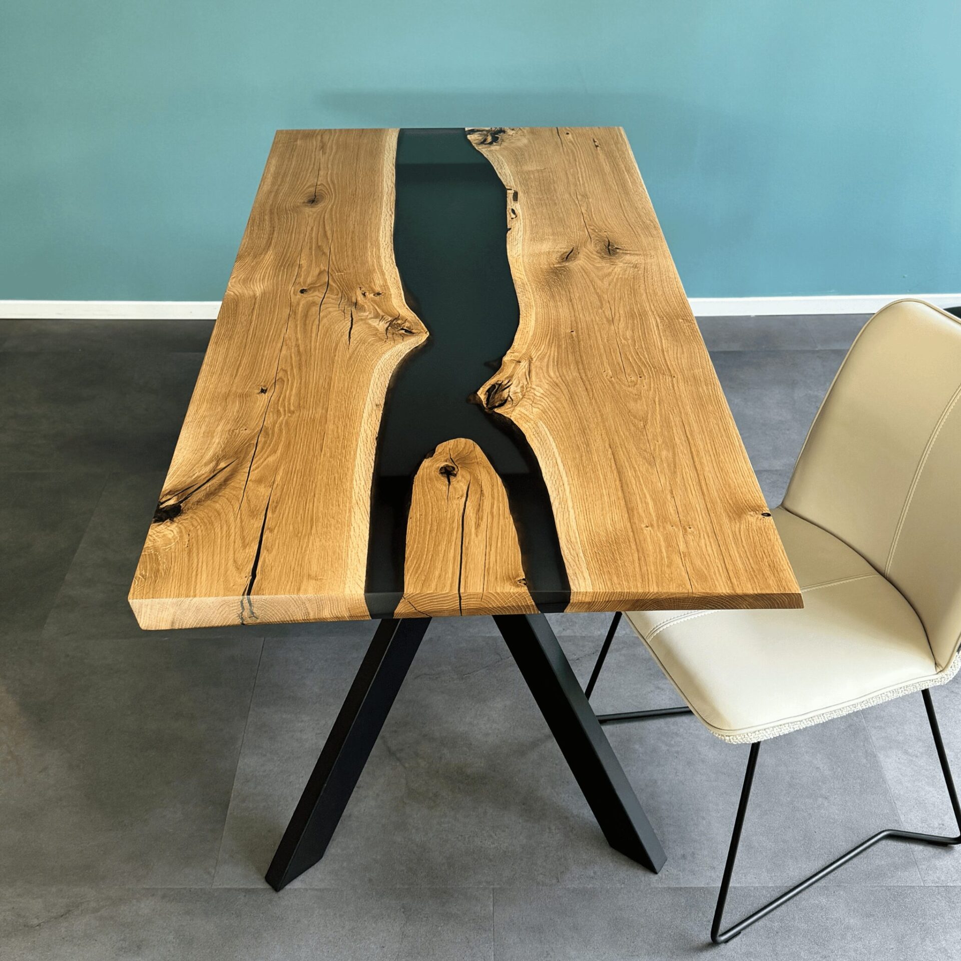 Erleben Sie das Zusammenspiel von Natur und Design mit dem Epoxidharz-Tisch Nara – ein kraftvolles Statement in jedem Wohnambiente. Gefertigt aus sorgfältig ausgewähltem Eichenholz, das aus einem einzigen Stamm geschnitten und mit transparentem, dunkel getöntem Epoxidharz perfektioniert wurde, beeindruckt dieses einzigartige Werkstück durch seine 3D-Kante und die faszinierende Holzmaserung.