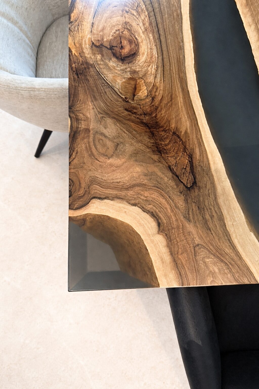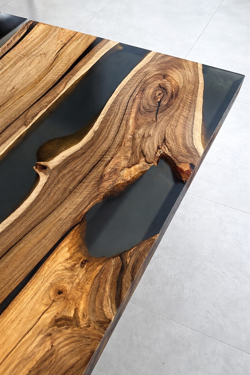 • Individuell gestaltetes Epoxidharz bis in die Tischkante eingearbeitet