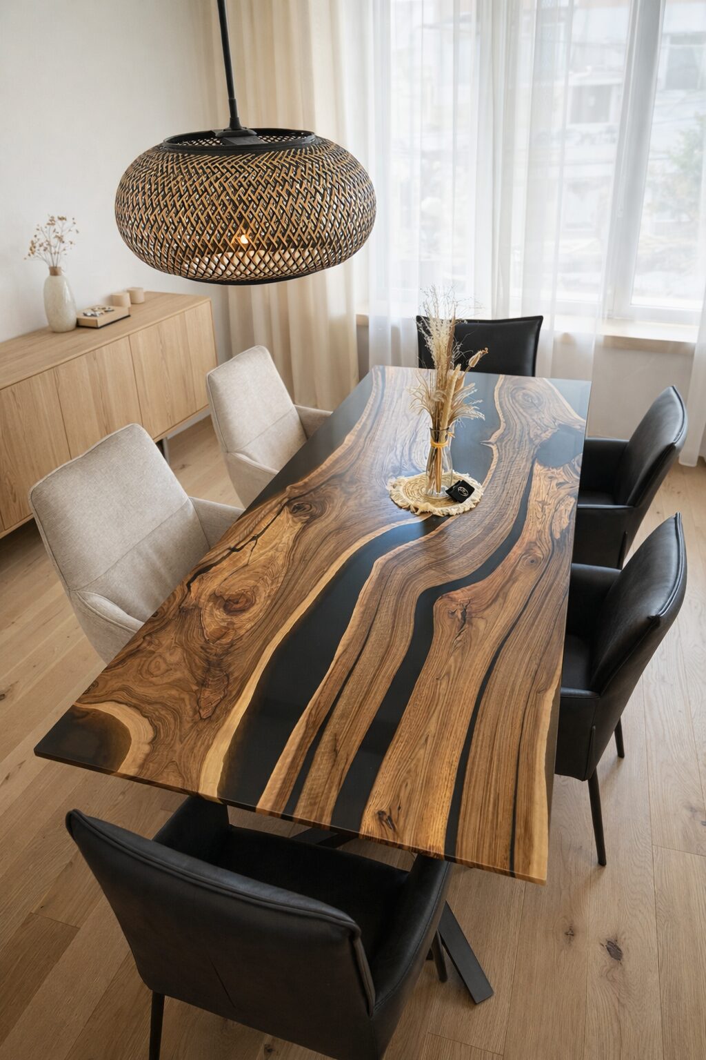 Jedes Detail dieses Tisches ist sorgfältig aufeinander abgestimmt: Das Metallgestell, hier in markantem Schwarz gezeigt, ist in sämtlichen RAL-Farbtönen pulverbeschichtbar und wird in echter JuRez Qualität vom Schlosser gefertigt. Die Freiform der Tischkante und das frei gestaltbare Epoxidharz – wahlweise klar, farbig, mit Metallicpigmenten oder Wellenstruktur – machen den River Table Epoxidharz Nuvora zu einem einzigartigen Designmöbel, das natürliche Materialien mit moderner Formensprache verbindet. Wer einen hochwertigen, langlebigen Epoxidharz Tisch kaufen möchte, findet im Modell Nuvora ein echtes Highlight für jedes Interieur.