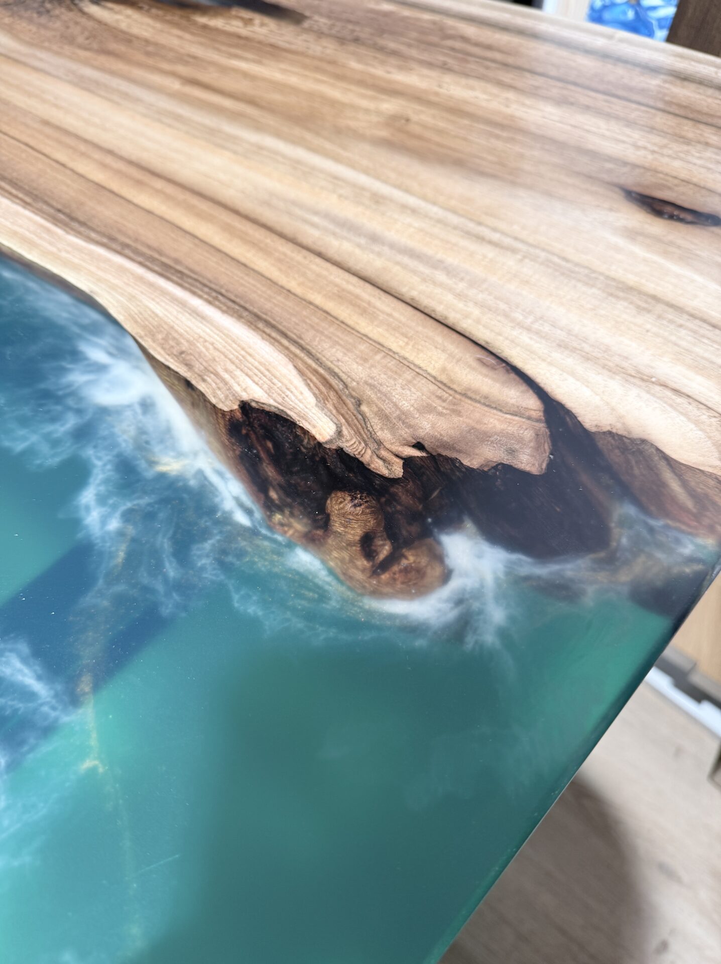 Die aufwendig gestaltete Epoxidharzschichtung verleiht dem Viridion seine unverwechselbare Optik: Eine tiefgrüne Basis bildet den ruhigen Untergrund, darüber legt sich ein sanfter, weißer Wolkeneffekt, der an natürliche Strömungen erinnert. Abschließend wird das Design mit einer transparenten Schicht versiegelt, wodurch eine beeindruckende Tiefenwirkung entsteht. Das Ergebnis ist ein Epoxidharztisch, bei dem die Holzstruktur nicht überdeckt, sondern bewusst hervorgehoben wird – klar sichtbar, detailreich und von außergewöhnlicher Präsenz.