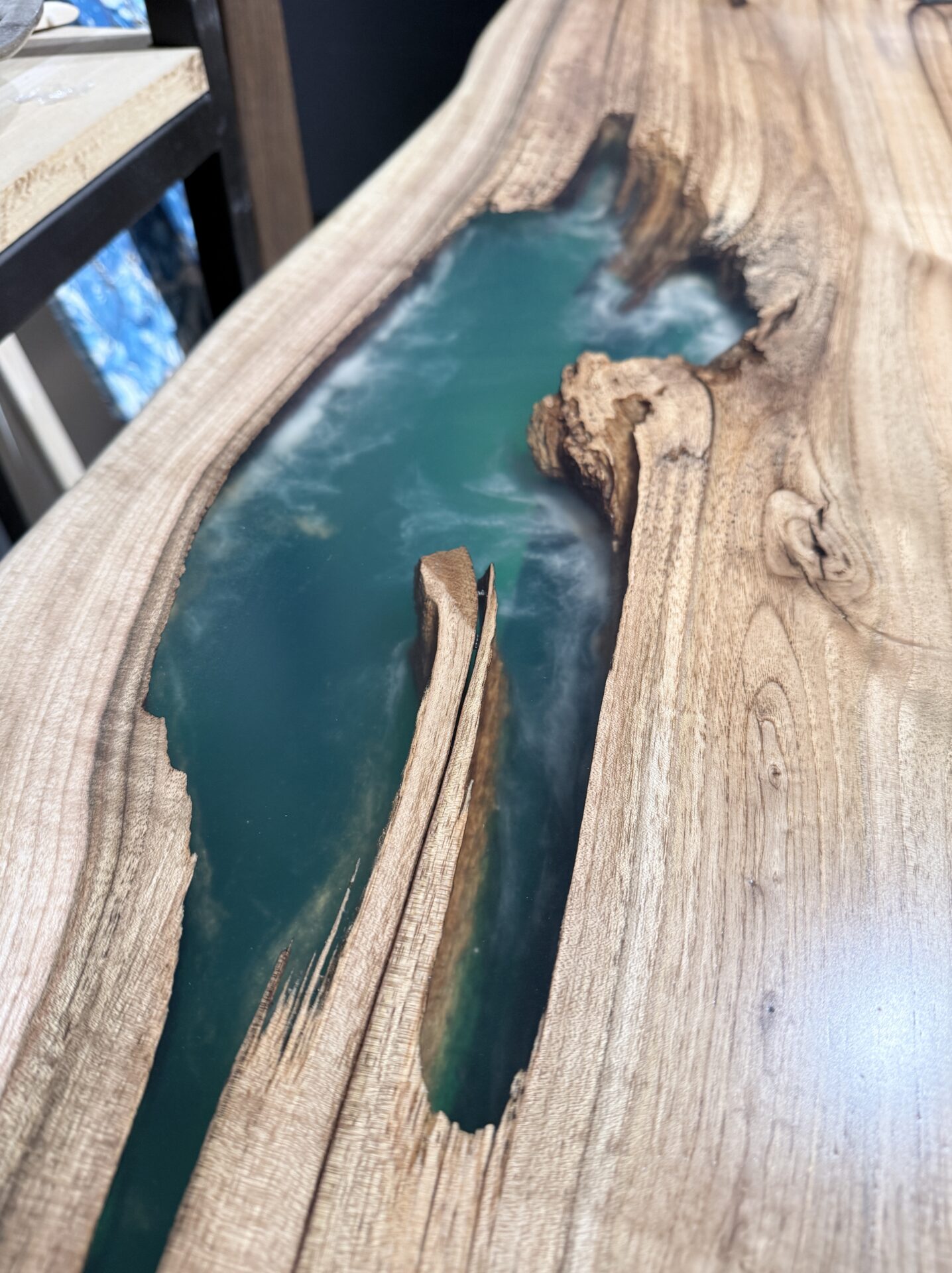 - Rivertable Design mit beeindruckender Tiefenwirkung und sichtbarer Holzstruktur